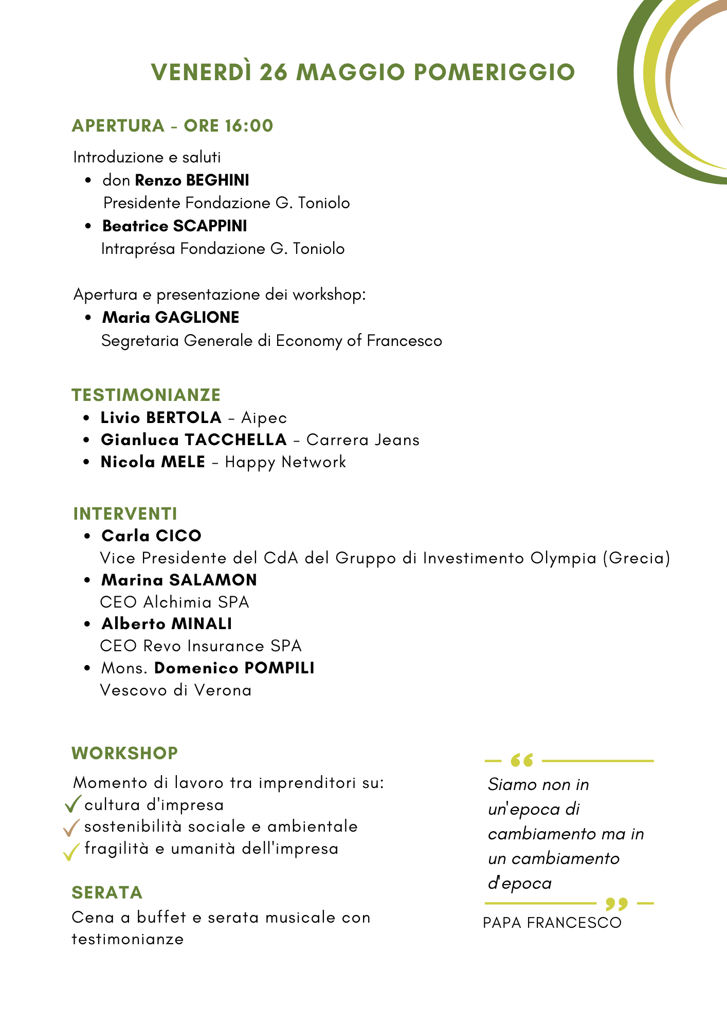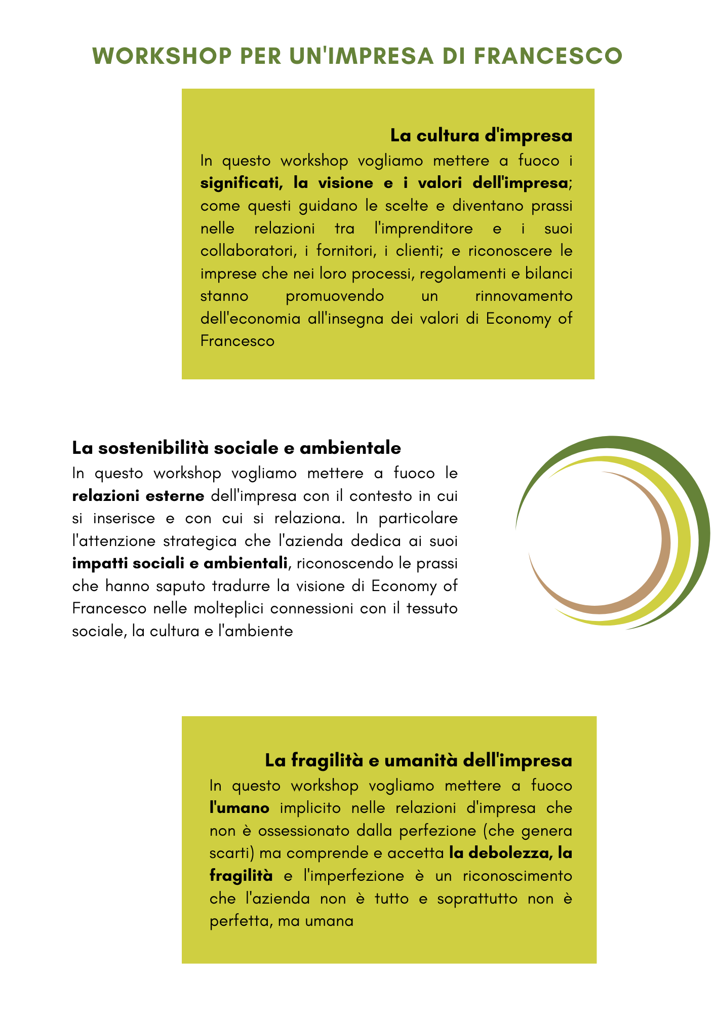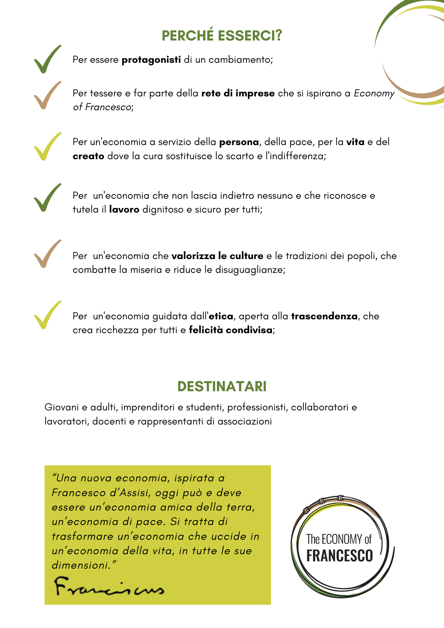 L’appuntamento di Assisi non è stato solo un evento, ma è divenuto un paradigma di riferimento che va tradotto in cultura, iniziative, opere, strumenti concreti e operativi. Attraverso testimonianze, interventi e confronti invitiamo i partecipanti ad accogliere la sfida di misurarsi sul “patto per l’economia” dei giovani con papa Francesco: L’IMPRESA di Francesco.